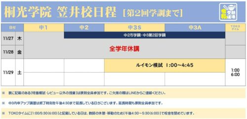 授業の再開は11/29(土)からになります。当日は中3ルイモン模試と個別授業です。