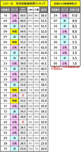 全体のデータが出そろうのは明日になりますが,笠井校生(集計日の欠席者を除く)のみのランキングを先にお知らせします。冬休みが終わり,学校の授業も通常日程に戻りだしたのが先週の1週間です。