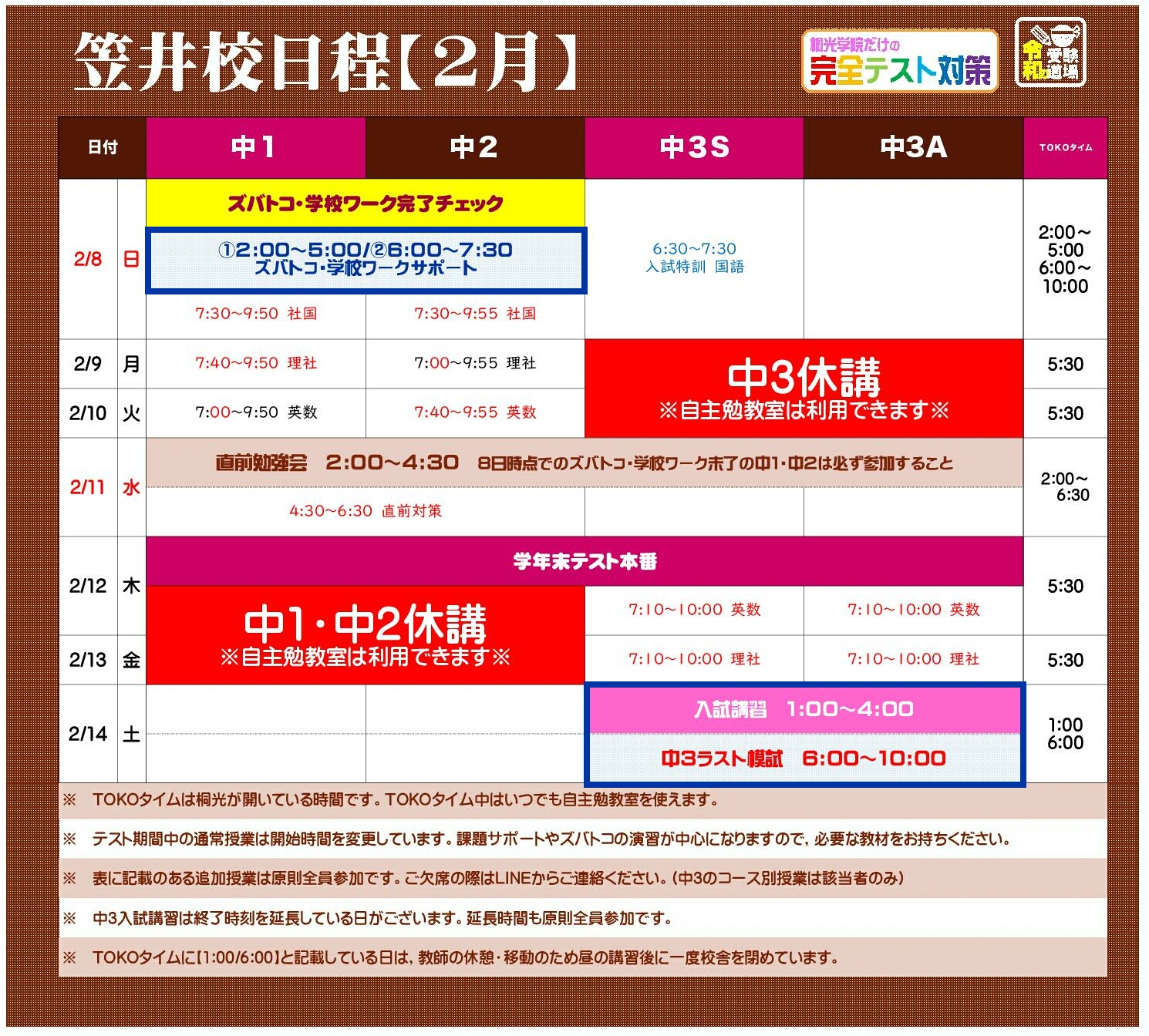 ②2/14に最後の中3模試を追加しました。模試の実施に伴い,入試講習の延長をなくしていますので,そちらもあわせてご確認ください。
