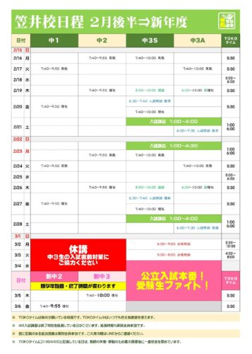 合格特訓の2日間と3/4(水)は,中3生の最後の対策のため,現小5~中2は全ての授業が休講となります。先輩たちの応援にご協力よろしくお願いいたします。