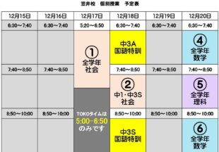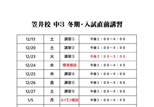 BLOG2025/12/10中3冬期・入試講習日程 …12/13(土)より,中3の冬期・入試直前講習がスタートします。 終了時刻は変更していることもございます…