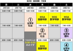 BLOG2026/02/102/16~21 個別日程…来週は久しぶりに個別授業再開です! 学年末テストの振り返りなどに活用していきましょう。