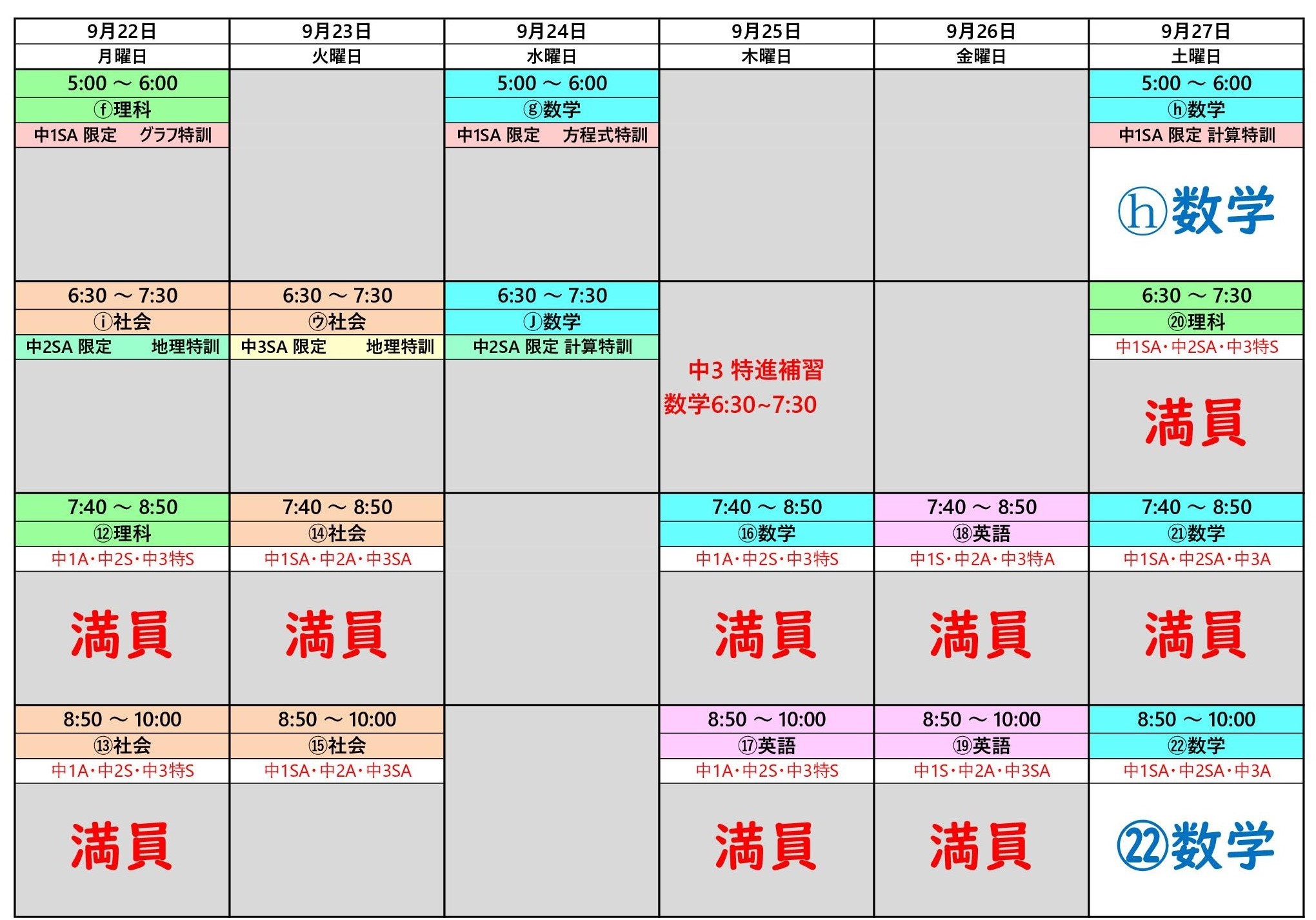 9月27日(土)の個別授業について,午後5:00~6:00の中1限定の数学と,午後8:50~10:00までの数学は,まだ空きがあります。