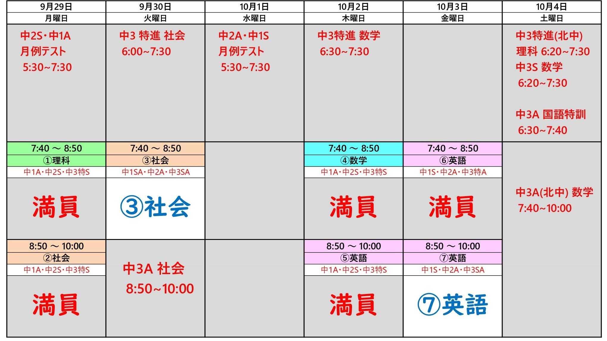 来週は中1・中2の月例テストの実施,中3の特別授業や対策授業がありますので,個別授業の枠が少なくなっております。