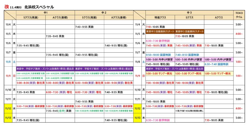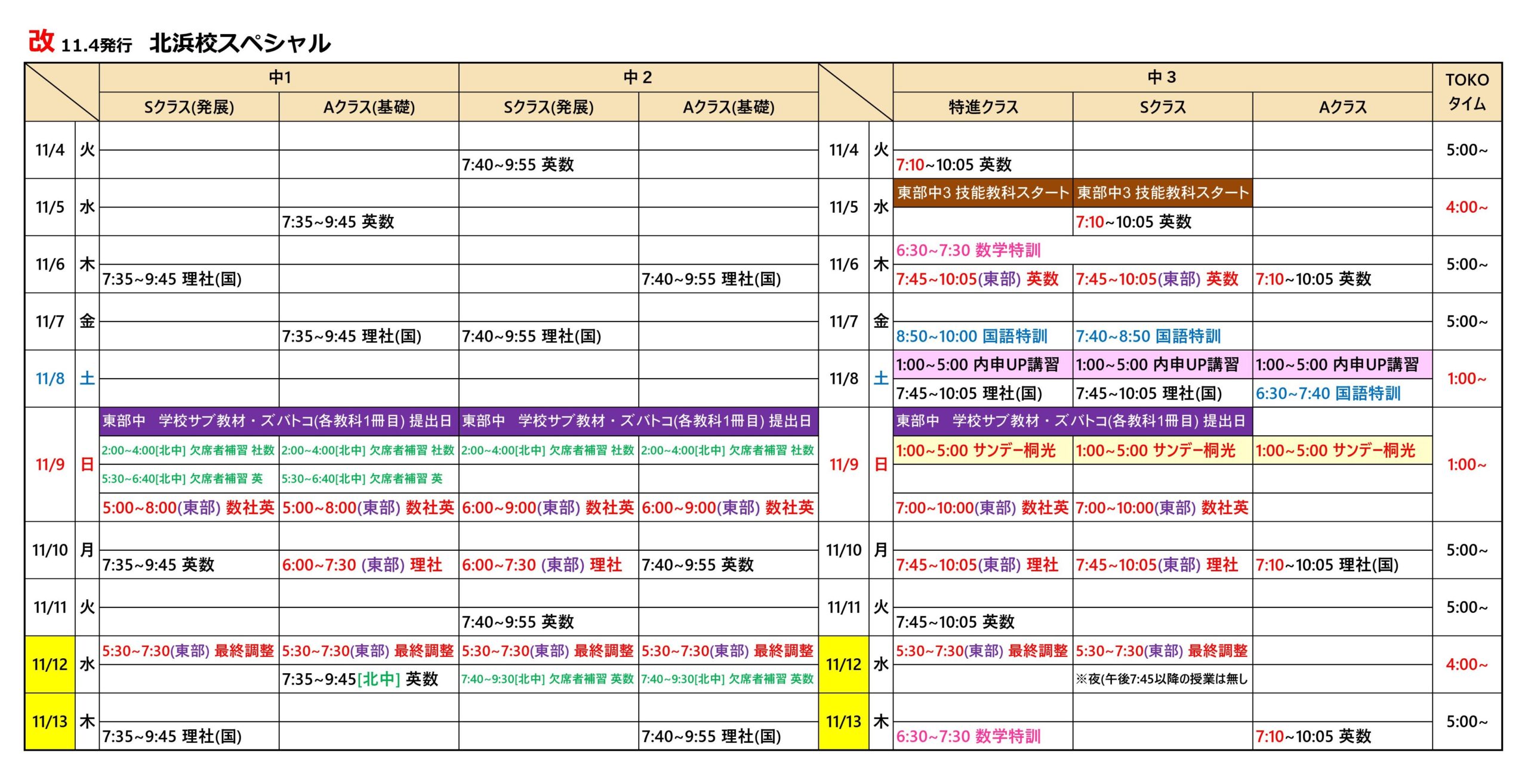 だいぶ遅れてしまいましたが, 11/13までの予定はこちらです。東部中の期末テスト直前スケジュールに加え, 北浜中2のインフルエンザや体調不良に伴う欠席の振替授業が入っています。