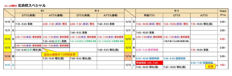 なお11/13(木)は5時間目と6時間目はカットと学校の年間予定表に書かれていますので, 中1Sクラスは早い時間へと時間変更をかけていますが, もともとの時間(午後7:35~9:45)の方が都合が良いという場合はその時間(北中と書かれている方)に参加してくれても構いません。