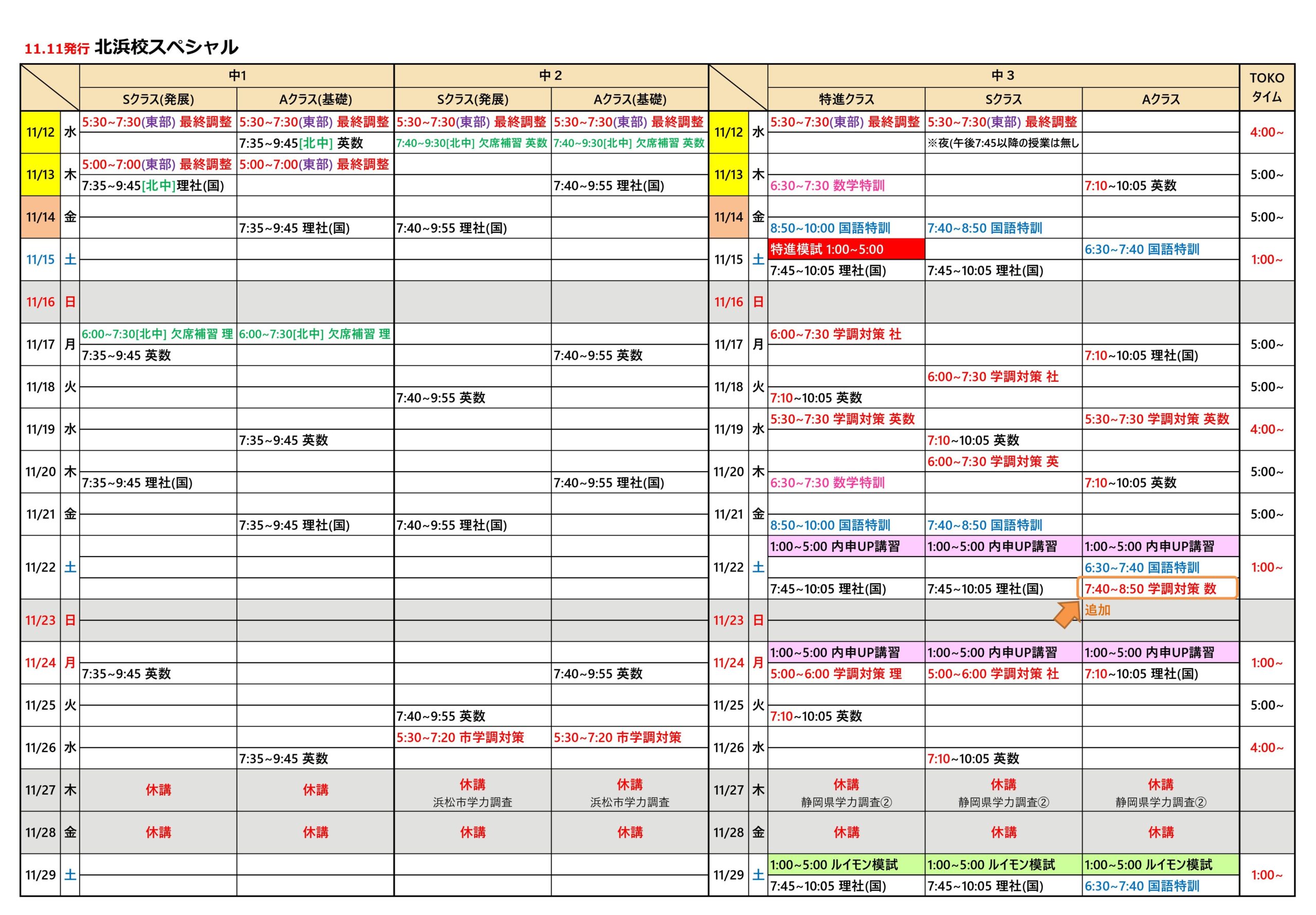 中3は11/27に静岡県学調があります。このテストが終わるといよいよ中学校の先生たちは通信簿の成績(内申点)を付ける仕事にとりかかります。静岡県の高校入試に影響がある内申点は, 中3の12月に判明する内申点です。つまりは,中3生が内申点のために努力出来る期間は, 残りあと2週間あまりということ。北浜校では出来る限り学調対策, 単元テスト対策をして中3の内申点アップに尽くしていきます。