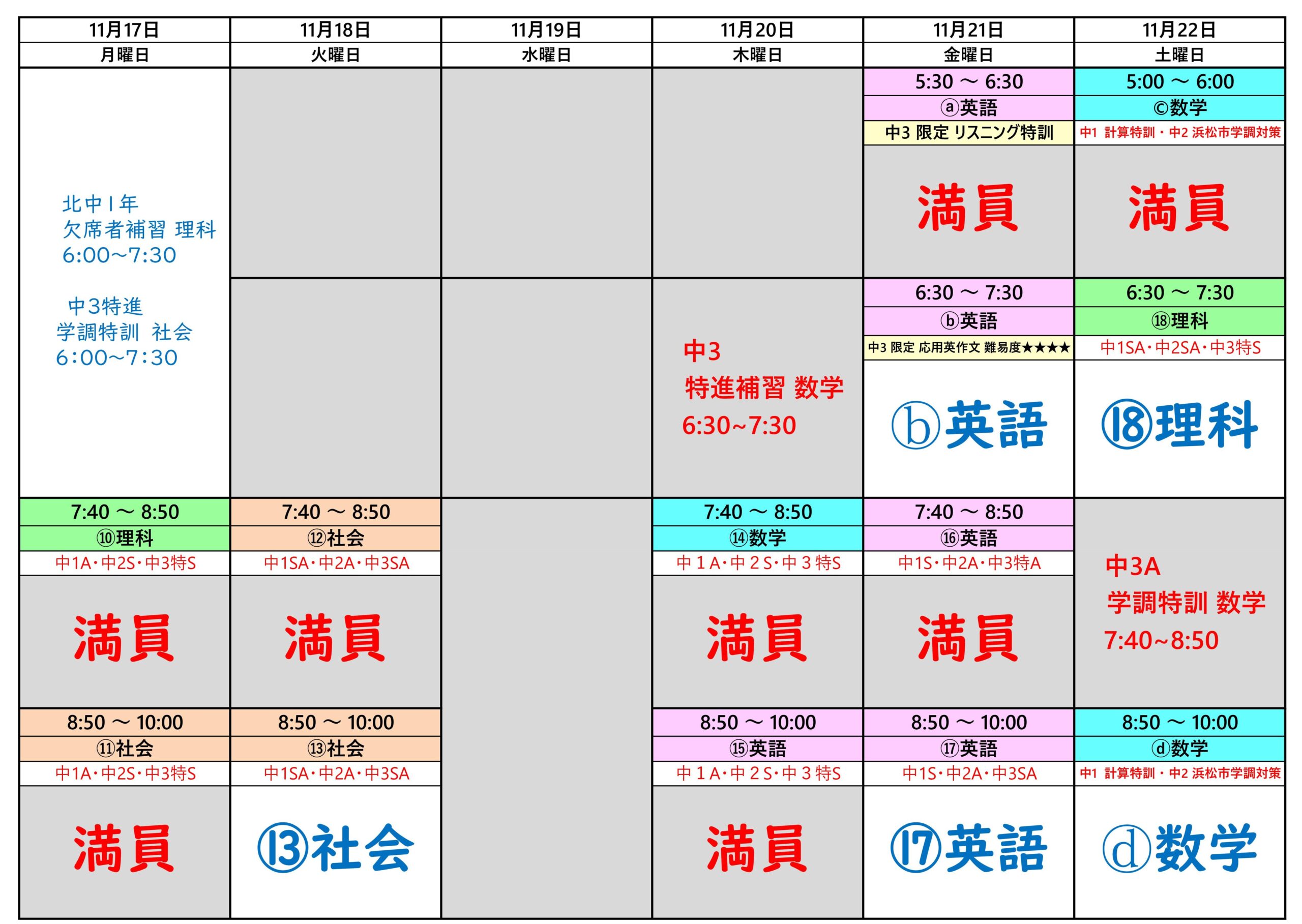 表のⓓの部分は,中1の数学計算特訓,中2の浜松市学力調査(数学)の対策を実施いたします。