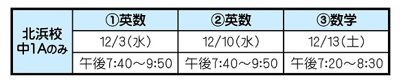 12/3(水)・12/10(水)の通常授業を英数基礎特訓の内容にして, さらに12/13(土)に数学の特訓を追加します。もちろん今回のプラス授業も追加料金はかかりません。4月に中学に入学した子たちももうすぐ中2になろうとしています。早いものです。冬休み前に基礎を固めて,年明けの県学調に自信を持って臨んで欲しいです。