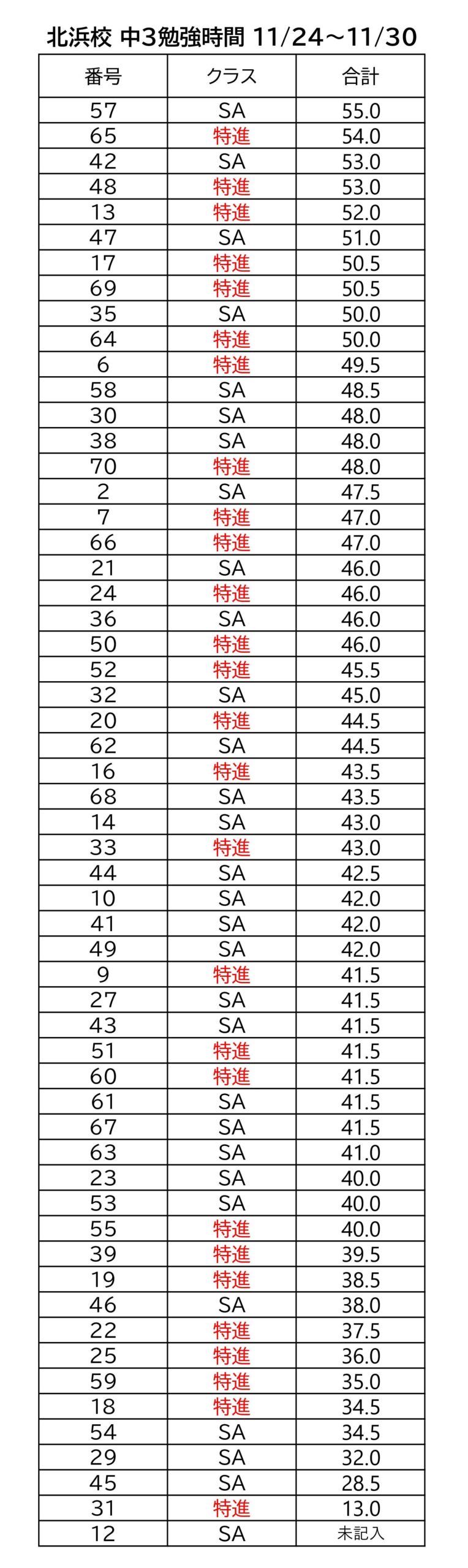 中3は勉強時間を管理していきます。さしあたり11月最終週の勉強時間の集計が終わりましたのでご覧ください。なお生徒それぞれに学生番号がございます。生徒達は模試や確認テストなどの度に記入しているので自分の番号を知っています。親御さんにおかれまして,もしお子さんの番号がわからない場合はお子さんに確認をお願いします。