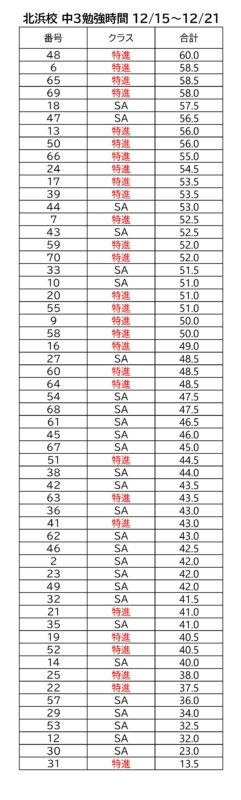 先週の中3の勉強時間を発表します。いよいよ勉強時間が増えてきました。今週は学校が無いのできっともっとたくさん勉強時間があると思いますが, 休講で集計できないのが残念です。後日, 11月から始めた勉強時間集計の一ヶ月間の合計をだしてみたいと思います。桐光の中3受験生がどれだけ勉強しているか。楽しみにお待ちください。