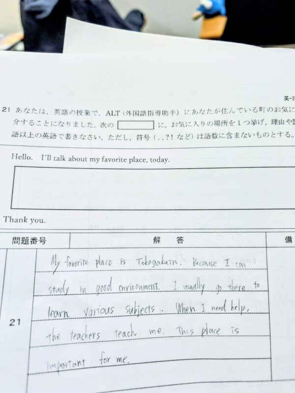 👩「私の好きな場所は桐光学院です。なぜなら良い学習環境があるからです。いつもいろんな教科を学びに行きます。私に助けが必要な時は先生たちが教えてくれます。この場所こそ私にとっては大切です。」