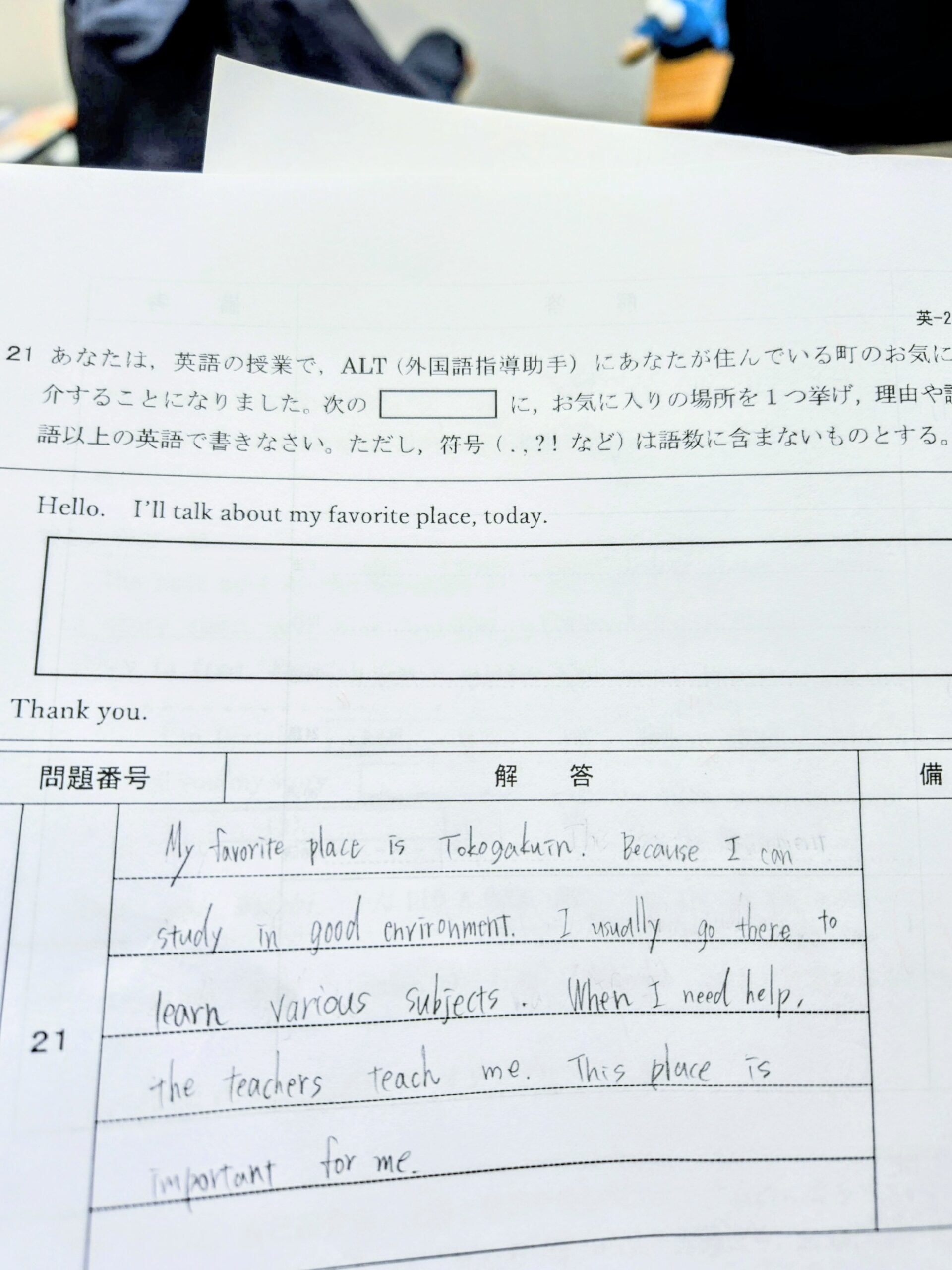問題 私の好きな場所についてお話します。