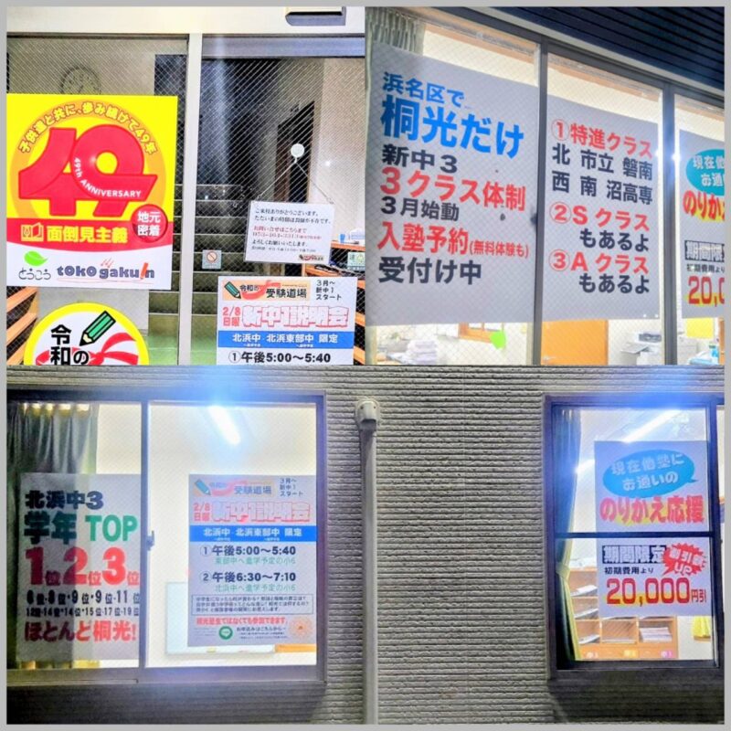 こんにちは。ここ数年, 北浜校は浜名区で唯一の中学三年生3クラス体制でやってきました。今中2はほぼ満席で3月以降どうなるのか?地域の中2のまだ桐光に通っていない生徒さんや保護者様はハラハラしていらっしゃるかもしれませんが, 安心してください。来年度も3クラス体制でやっていきます。無料体験を終え,3月からの入塾を予約してくれている子も何人かいる状況ですので, 「中3になったらやっぱり桐光でしょ!」と思っていらっしゃるみなさん, まずはお問合せ下さい。