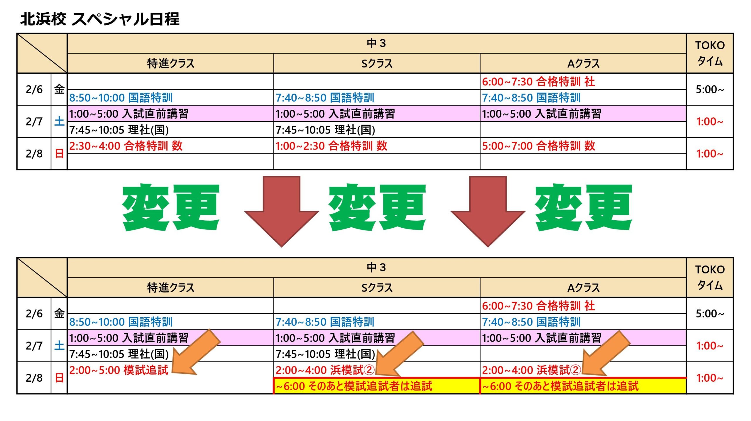こんにちは。急きょ中3浜模試を最後に実施することにしました。桐光の全校舎内の志望校別に競える, つまりさながら入試のような結果が出る模試で, 第1回はすでに終わり結果をみんな自分事として受け止めていました。模試についての説明が少し長くなりましたが, つきましては, 中3の日曜の時間に変更があります。ご確認ください。