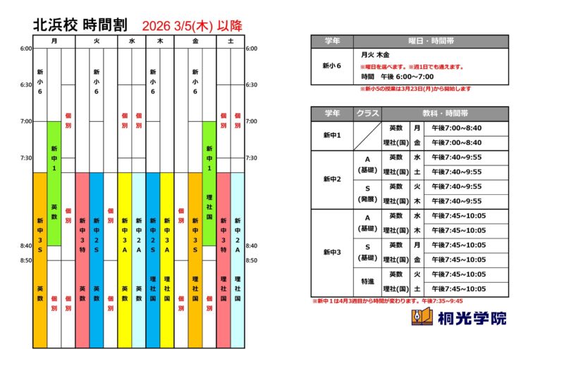 こんにちは。来月から塾業界は[新年度]になります。桐光学院ももれなく同じ流れになるにあたり, 新時間割にて授業を実施していきます。だいぶ前から生徒達に習い事などを確認して進めてまいりました。今まで曜日が変わる生徒も少なくありません。なお習い事の関係でイレギュラーな曜日に通う予定の子にはすでにその曜日を伝えています。お子さんと再度確認をお願いします。