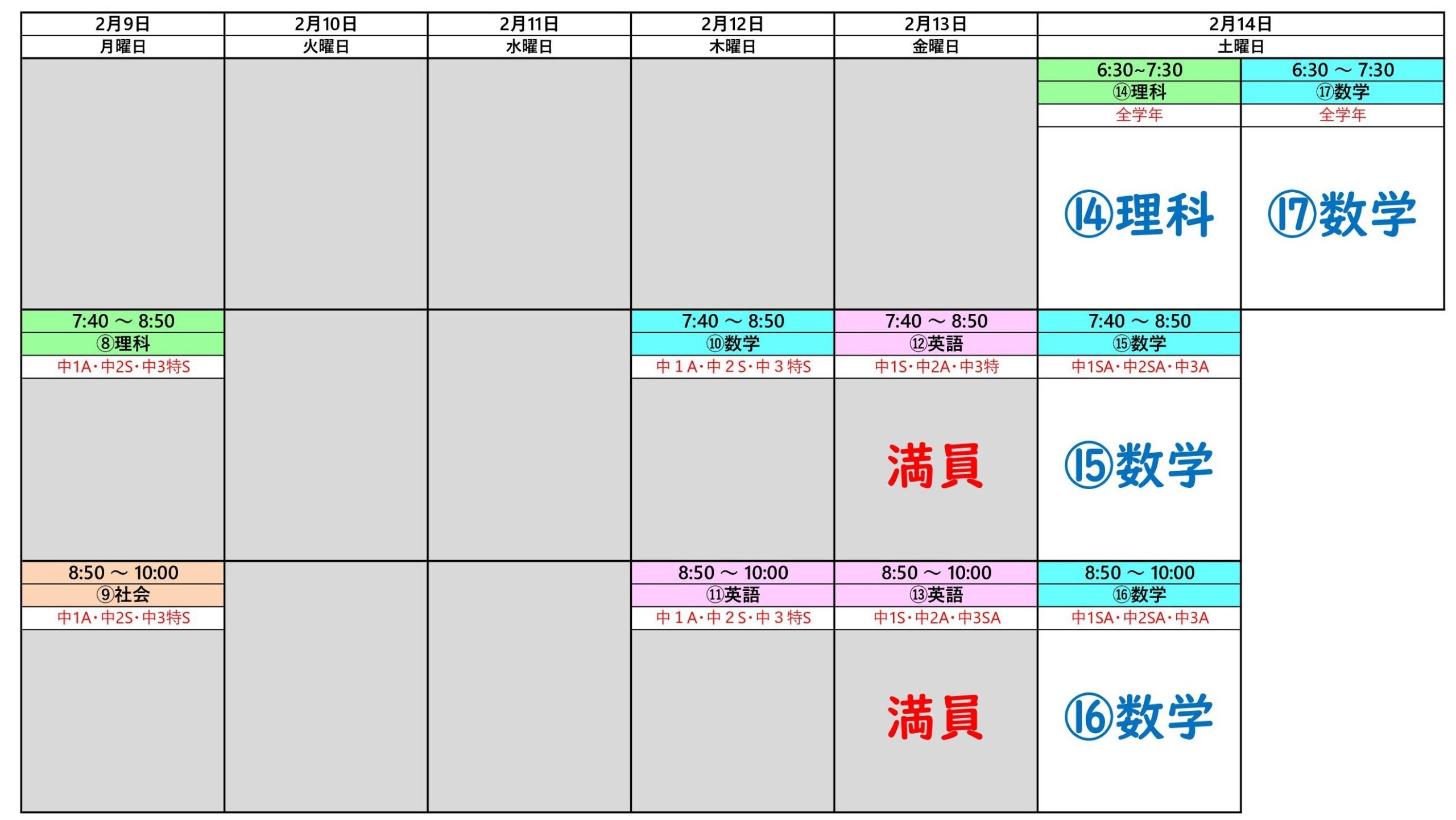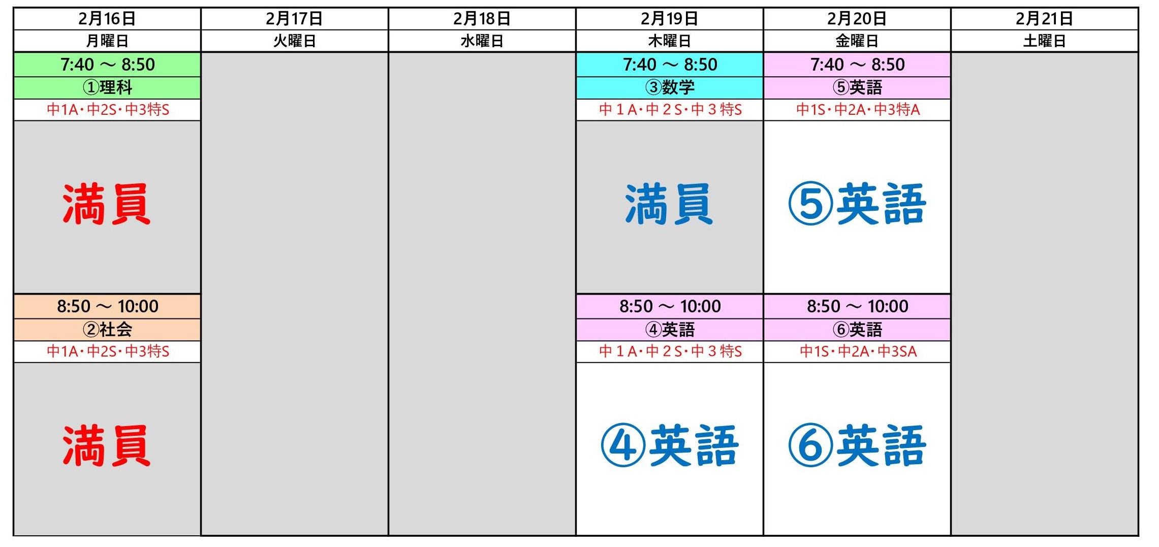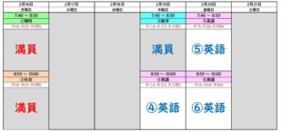 2月16日~20日の個別授業の日程です