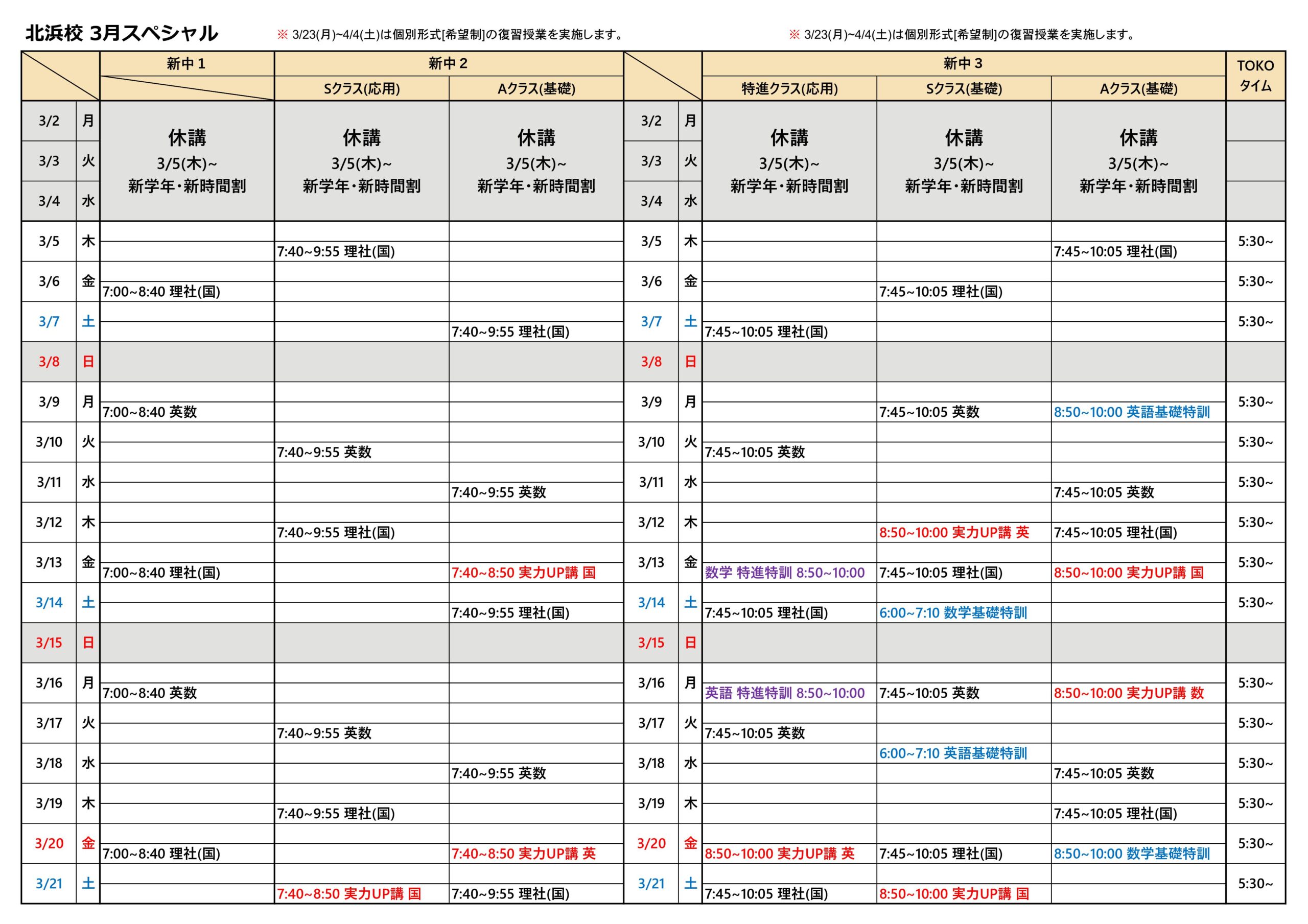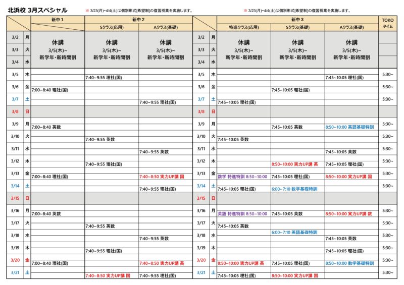★新中3特進クラスは[特進特訓], 新中3SとAクラスには[基礎特訓]を追加しました。