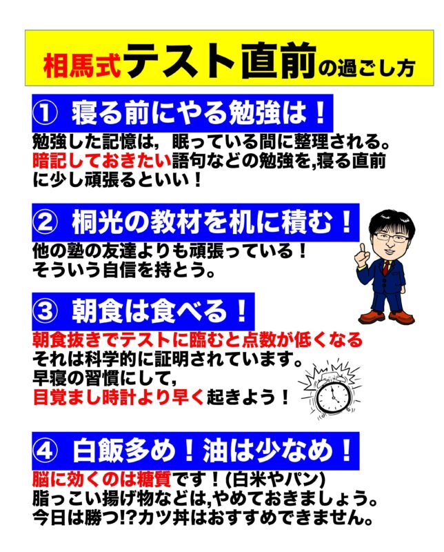 ついに明日は公立高校入試ですね。きっと桐光中3の生徒自身よりもご家族の皆さんの方が緊張なさっているのではないかと推察いたしております。今年の北浜校の受験生はどちらかというと根が明るく,受験が迫っていてもリラックスできている生徒が多いです。とはいえさすがに今日は内心穏やかでいられないかもしれません。そこで今日と明日のちょっとした心構えのススメを載せておきまます。