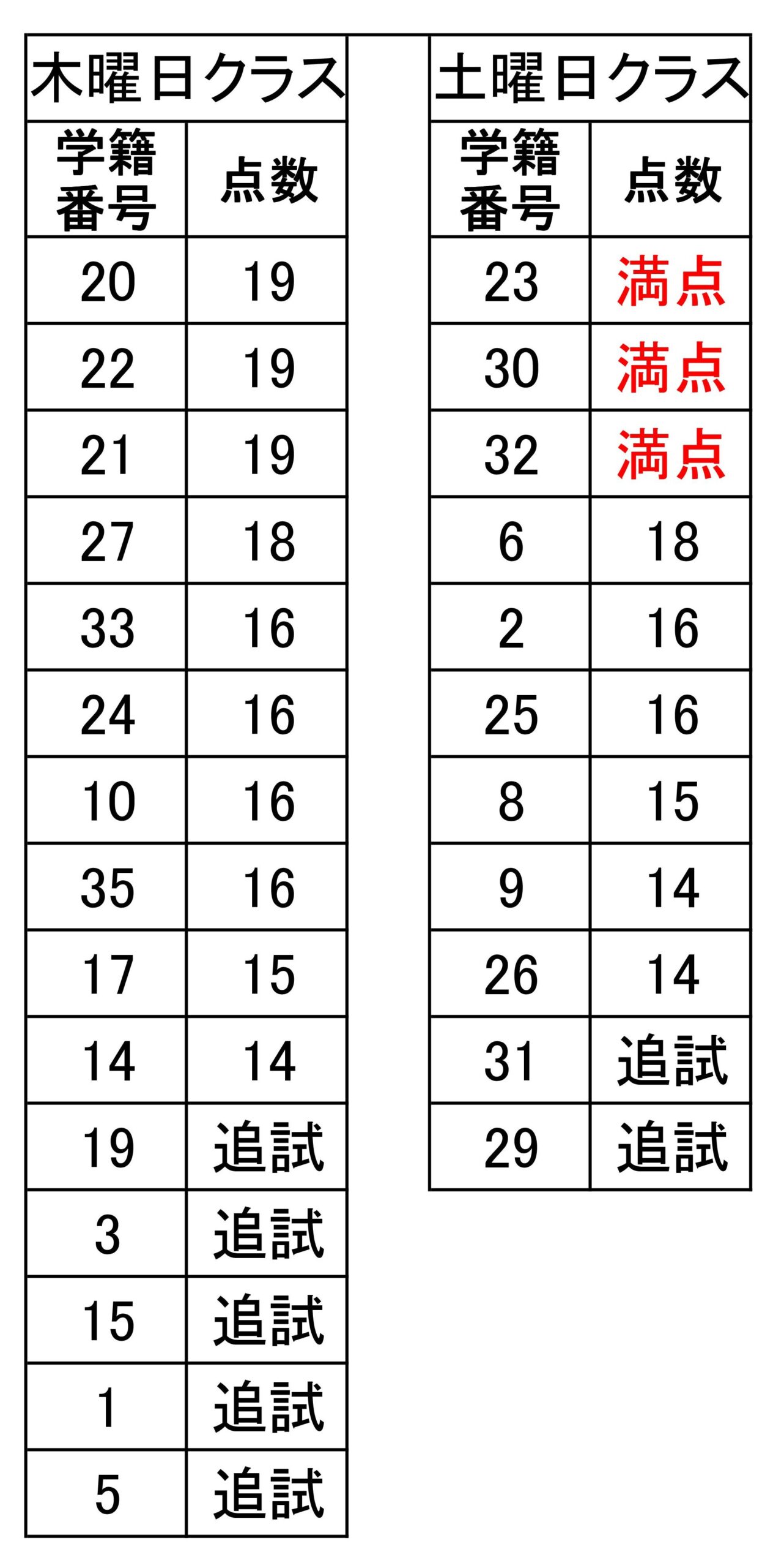 満点は土曜クラスの3人でした。(個人成績は下の画像)