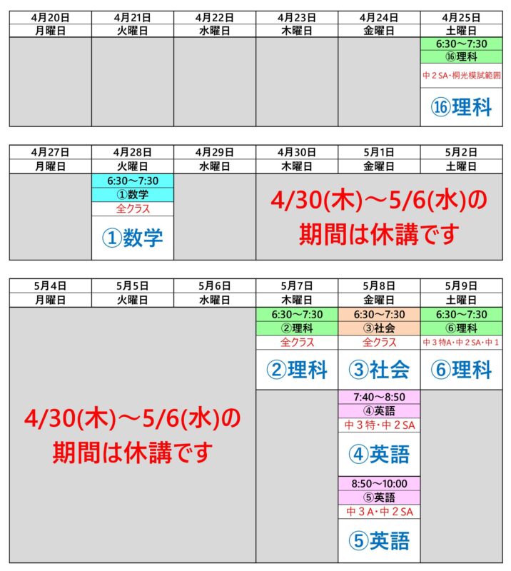 4/25(土)~5/9(土)の期間の個別授業の予定です。〔4/30(木)~5/6(水)の期間は休講となります。〕