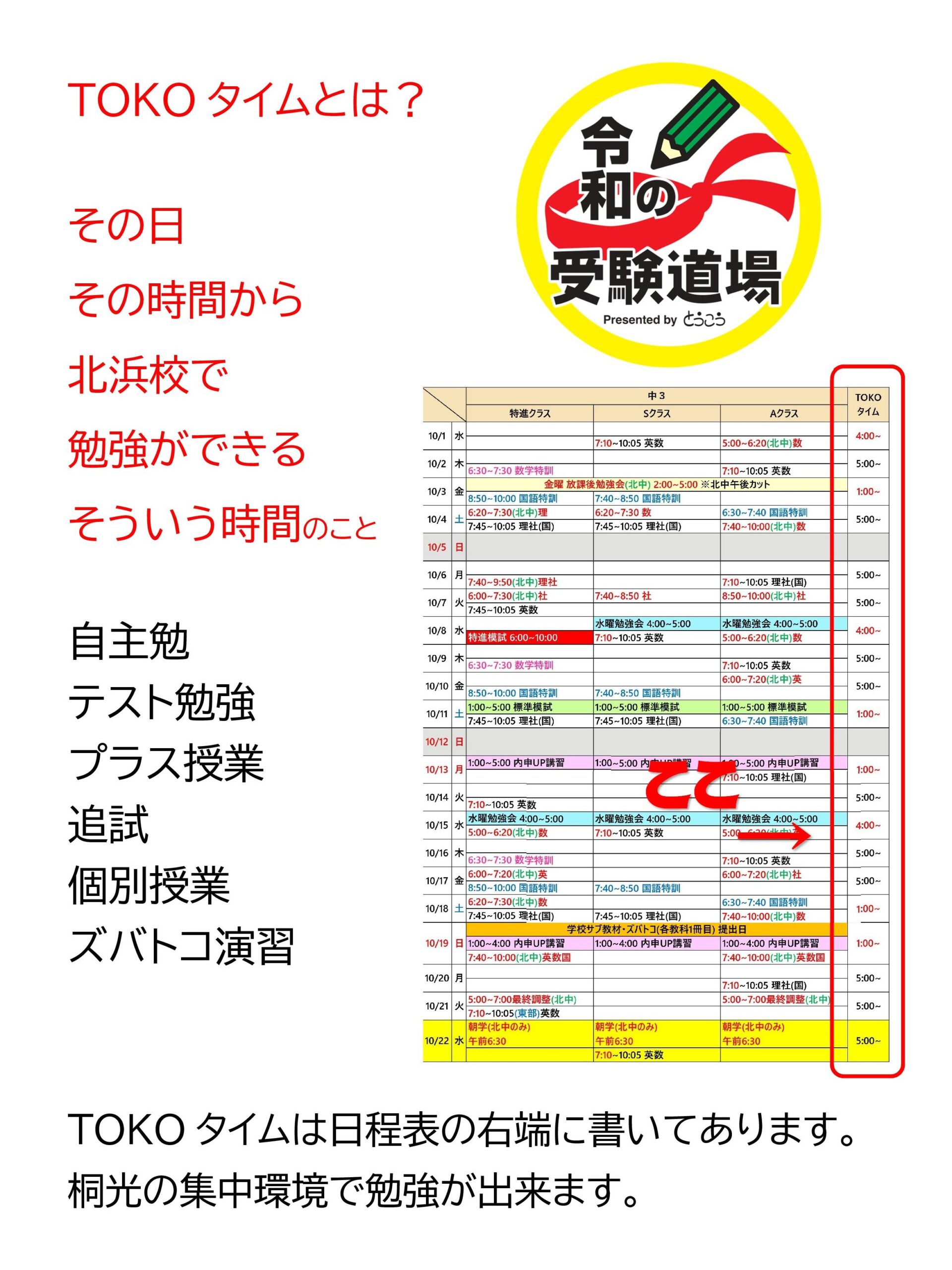 毎月お渡ししている北浜校スペシャルという日程表の右端に書いてある時刻。これが校舎開放のスタート時刻です。終わりの時刻が書いていないのは,毎日夜10時までと決まっているからです。TOKOタイムはある意味で最高です。どんな勉強でも何時から何時まででも無料で集中して頑張れるのですから!