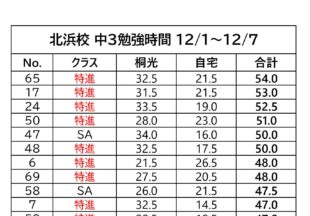 BLOG2025/12/10中3 勉強時間 12/1…こんにちは相馬です。 先週の勉強時間の集計(中3)が終わりました。 今回からは自宅学習と桐光での勉強時間…