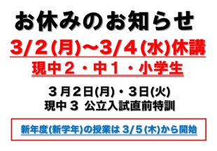 BLOG2026/02/15休講のお知らせ (相馬)こんにちは。ついにこのお知らせをする時が来ました。現中3受験生が最後に桐光で頑張る数日, これを告知する…