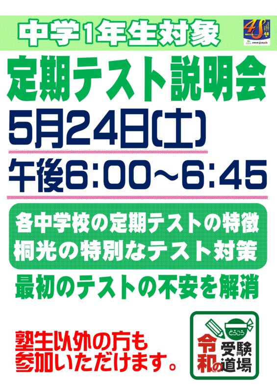 以下の日程で『中1定期テスト説明会』を実施致します。