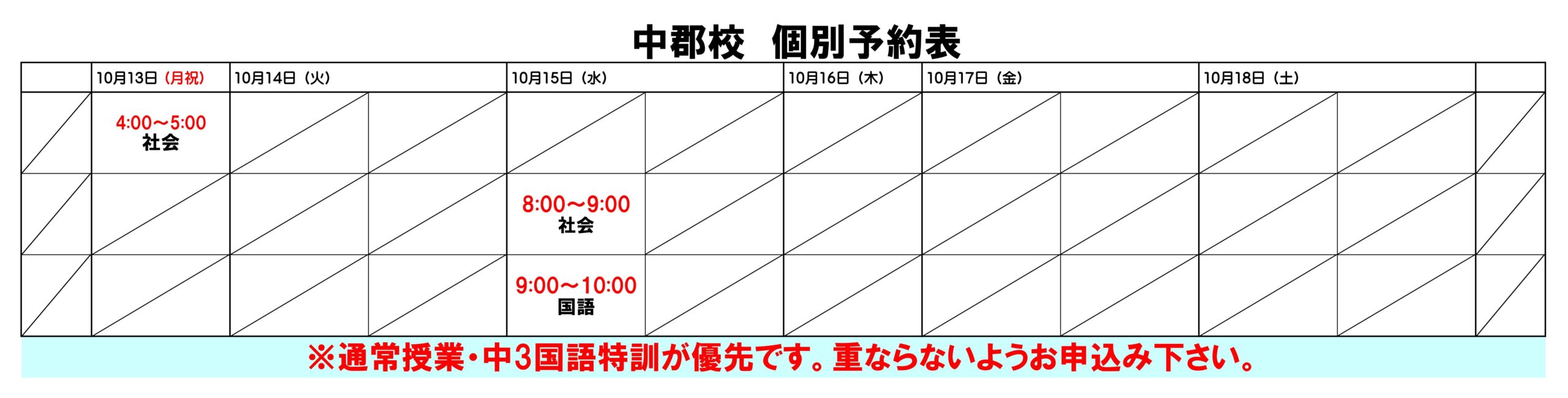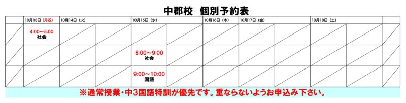 【全員参加】の通常授業・中3国語特訓がある場合はそちらが優先となり、そのお時間の個別授業はお申し込み頂けませんので、ご注意下さい。
