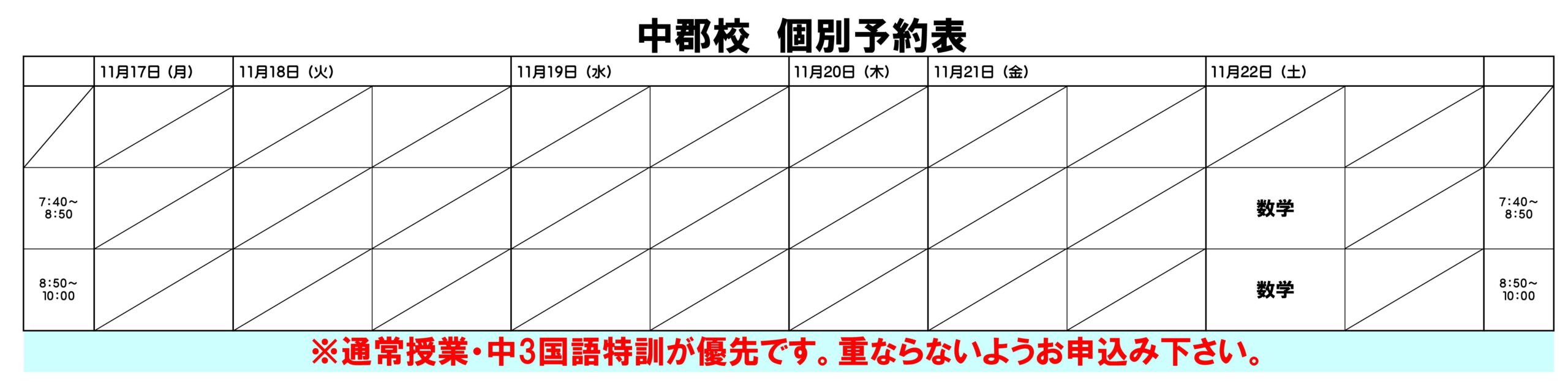 【全員参加】の通常授業・中3国語特訓がある場合はそちらが優先となり、そのお時間の個別授業はお申し込み頂けませんので、ご注意下さい。