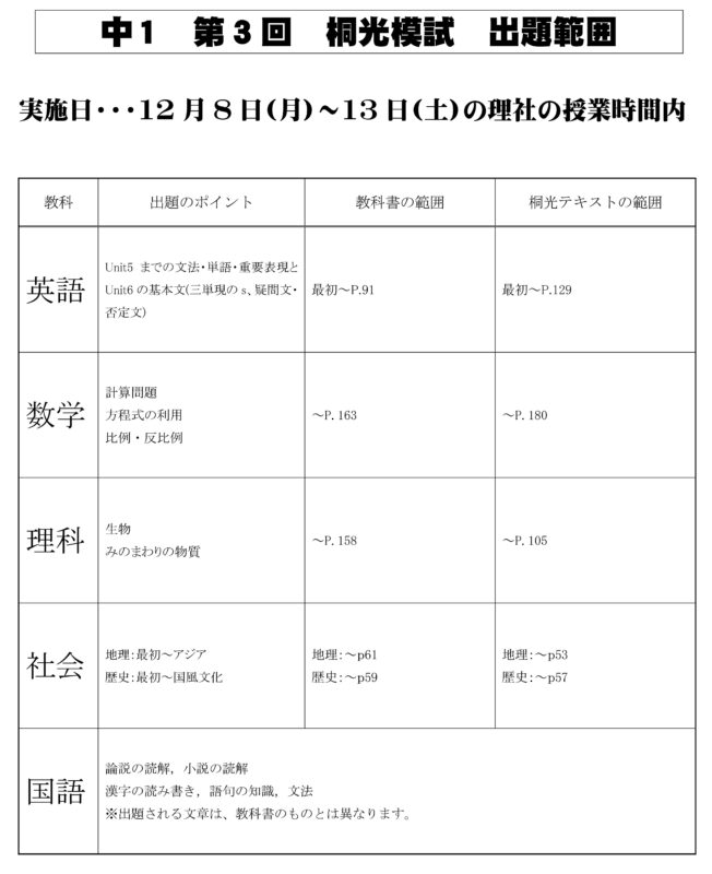 12/8の週に中1中2桐光模試を理社の通常授業内で実施致します。
