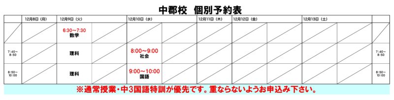 【全員参加】の通常授業・中3国語特訓がある場合はそちらが優先となり、そのお時間の個別授業はお申し込み頂けませんので、ご注意下さい。