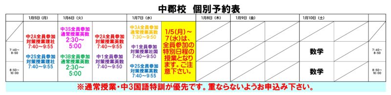 【全員参加】の通常授業・中3国語特訓がある場合はそちらが優先となり、そのお時間の個別授業はお申し込み頂けませんので、ご注意下さい。