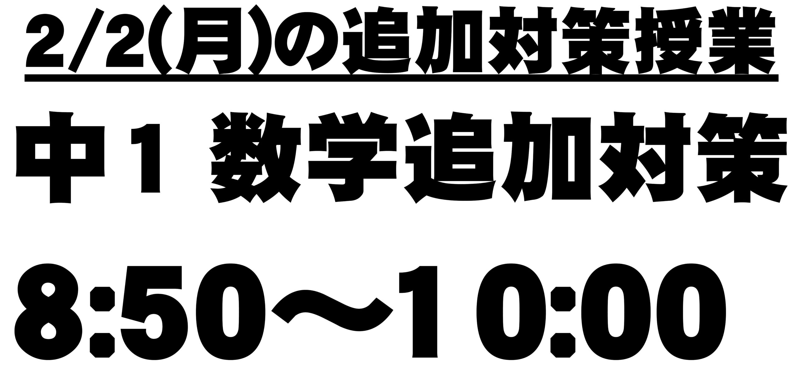 2/2(月)8:50~10:00にて、全員参加の中1追加授業(数学)を行います。
