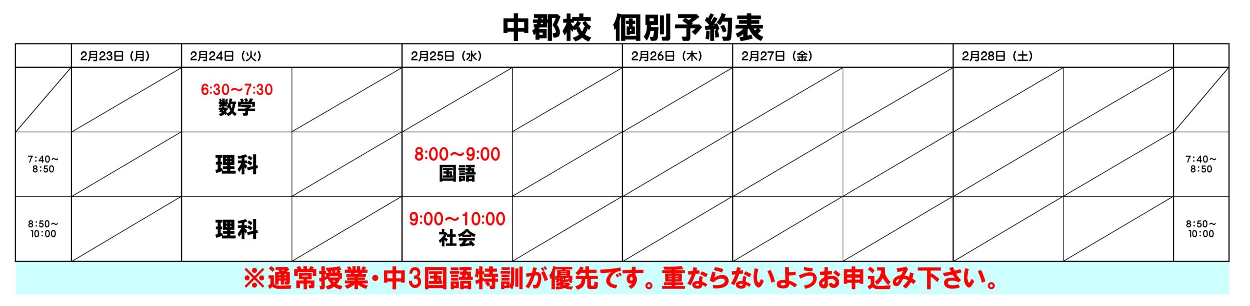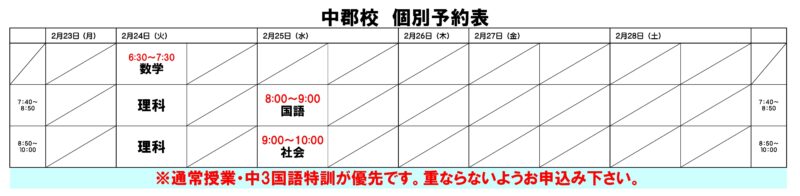 【全員参加】の通常授業・中3国語特訓がある場合はそちらが優先となり、そのお時間の個別授業はお申し込み頂けませんので、ご注意下さい。