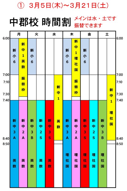 ③3/5(木)からは学年が1つ上がり、新中2と新中3は終了時間が5分遅くなります。