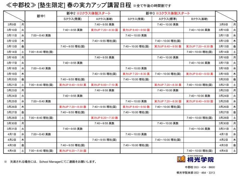 【重要】3月からの時間割 杉山|中郡校BLOG|桐光学院