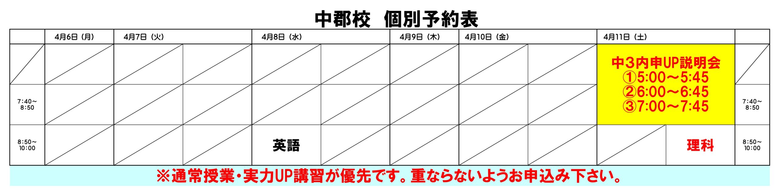 【全員参加】の通常授業がある場合はそちらが優先となり、そのお時間の個別授業はお申し込み頂けませんので、ご注意下さい。