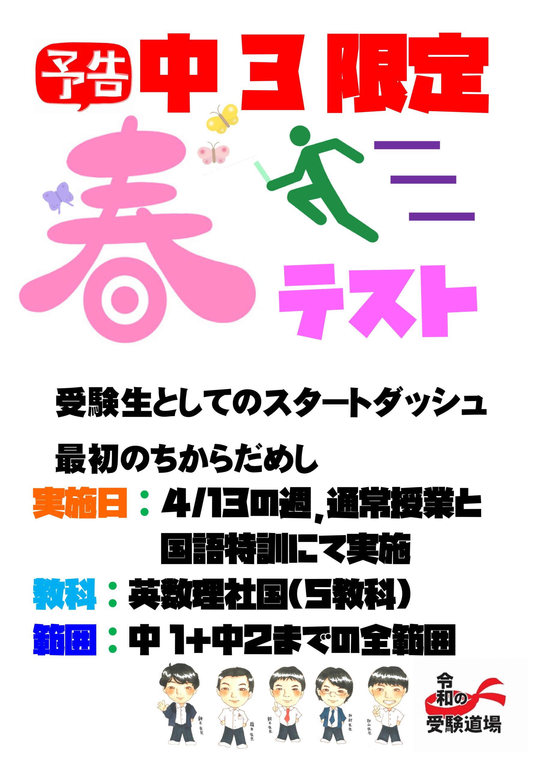 このテストは、4/13の週の通常授業とのその週からスタートする国語特訓の時間に行います。