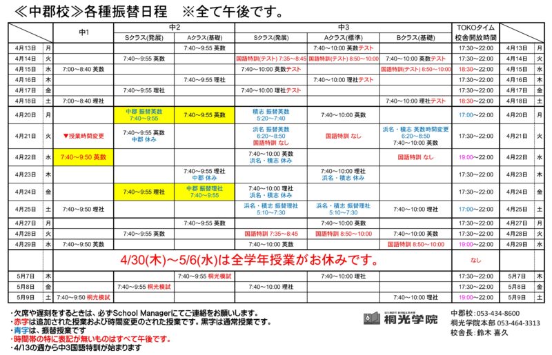③4/20の週から中1は通常授業の時間が7:40~9:50に変更