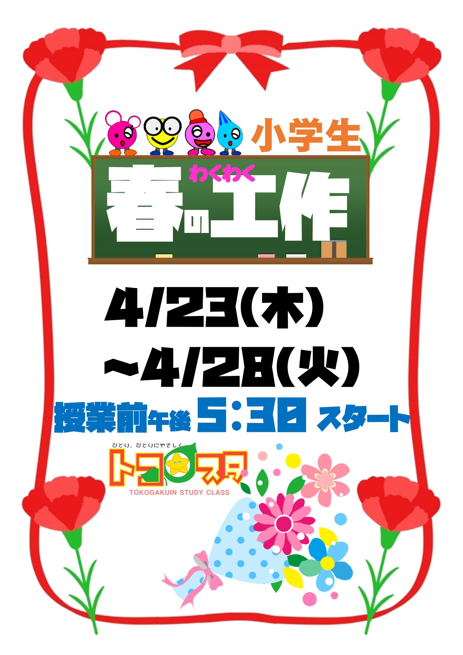 今回も春の工作を4/23(木)~28(火)の授業前5:30~にて実施致します。