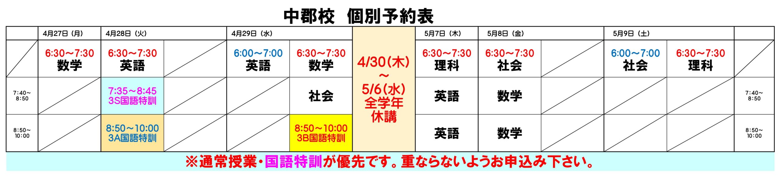 【全員参加】の通常授業・中3国語特訓がある場合はそちらが優先となり、そのお時間の個別授業はお申し込み頂けませんので、ご注意下さい。