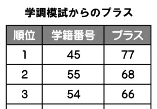 もっと見る6月の学調模試と9月の第一回学調との点数差です。 特に点数の上がった上位20名です。 学籍番号の下二桁を…