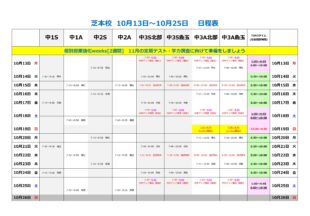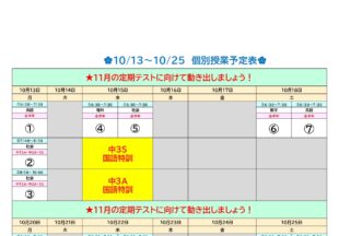 今週からの2週間分の個別日程を載せておきます。 10月27日より期末テスト対策に入っていきますので、 テ…
