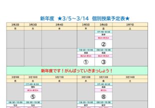 BLOG2026/02/26新年度[3.5~]の個別…来年度[3月5日から]の個別日程表を載せておきます。 3月はめいっぱい復習をしていきます。 新学年最高の…