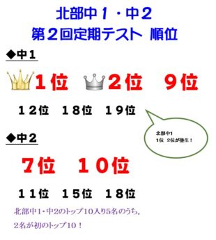北部中1はトップ10がもう一人、満点の教科がありました。