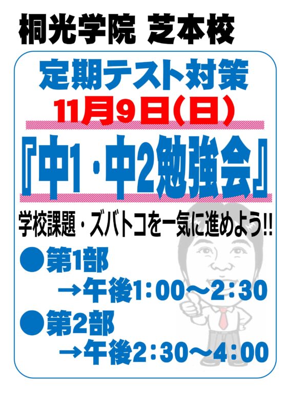 今週日曜日は『中1・中2限定の日曜勉強会』を実施します。