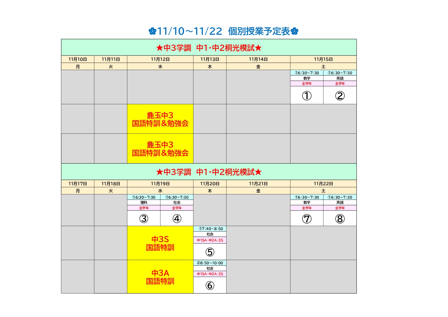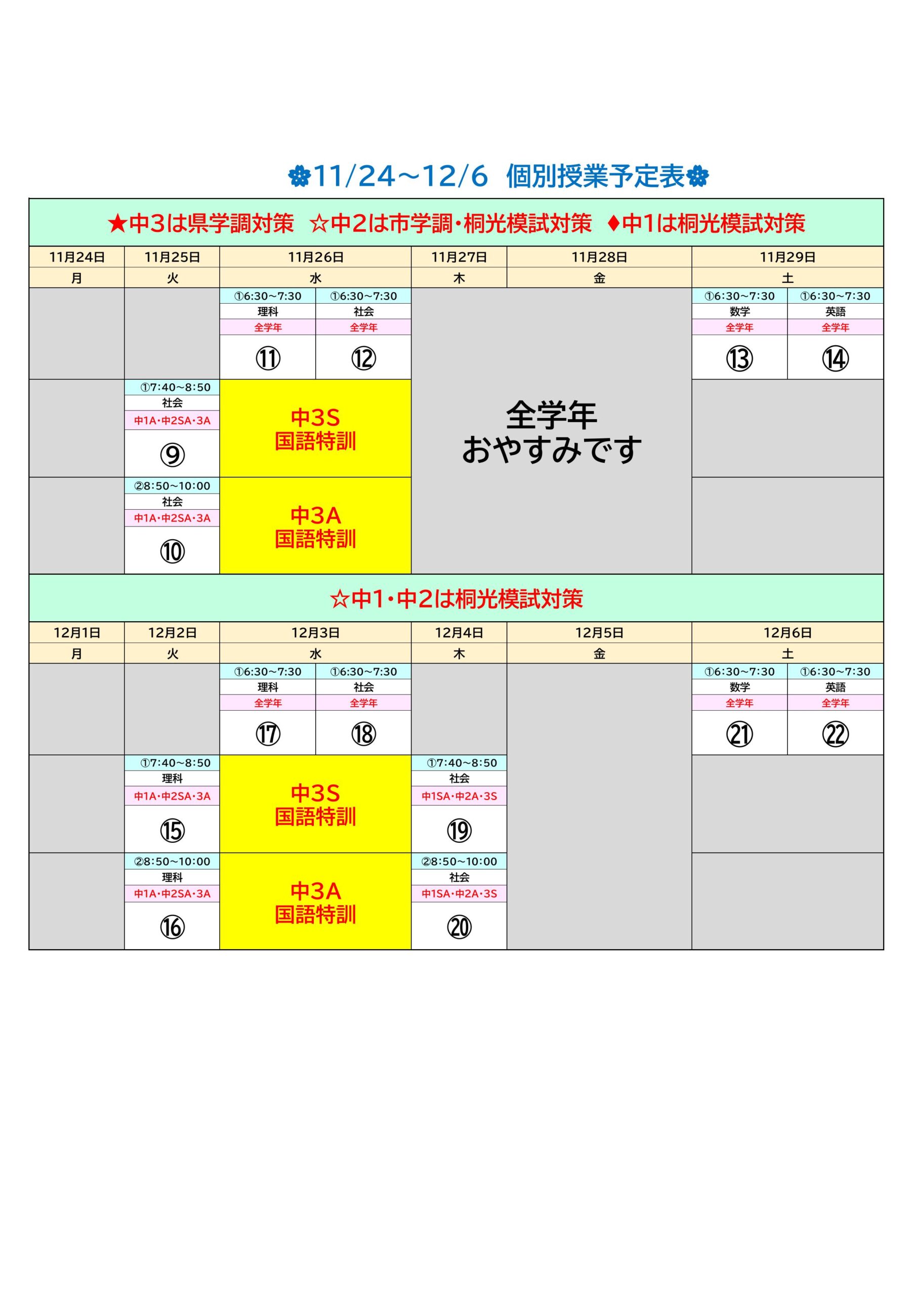 中学2年生は『11/27の浜松市学力調査』あります。
