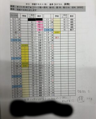本人の許可を得て載せますが、ある生徒は桐光で配ったペース配分表に日々自分がやったページ数を書き込んでいます。